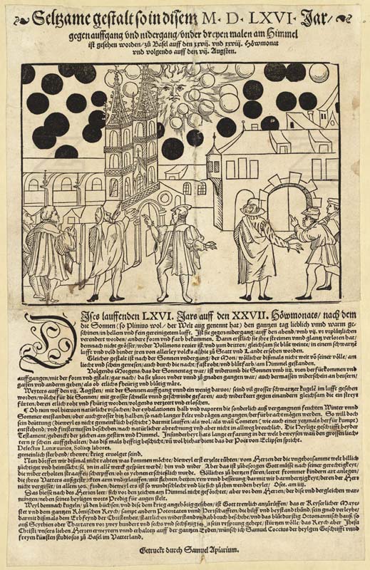 1566 celestial phenomenon over Basel [de; fr] A series of events on 27–28 July and 7 August 1566 reported in a Flugblatt (an early form of newspaper) as occurred in Basel, where red and black spheres have led an apparent battle in the sky.