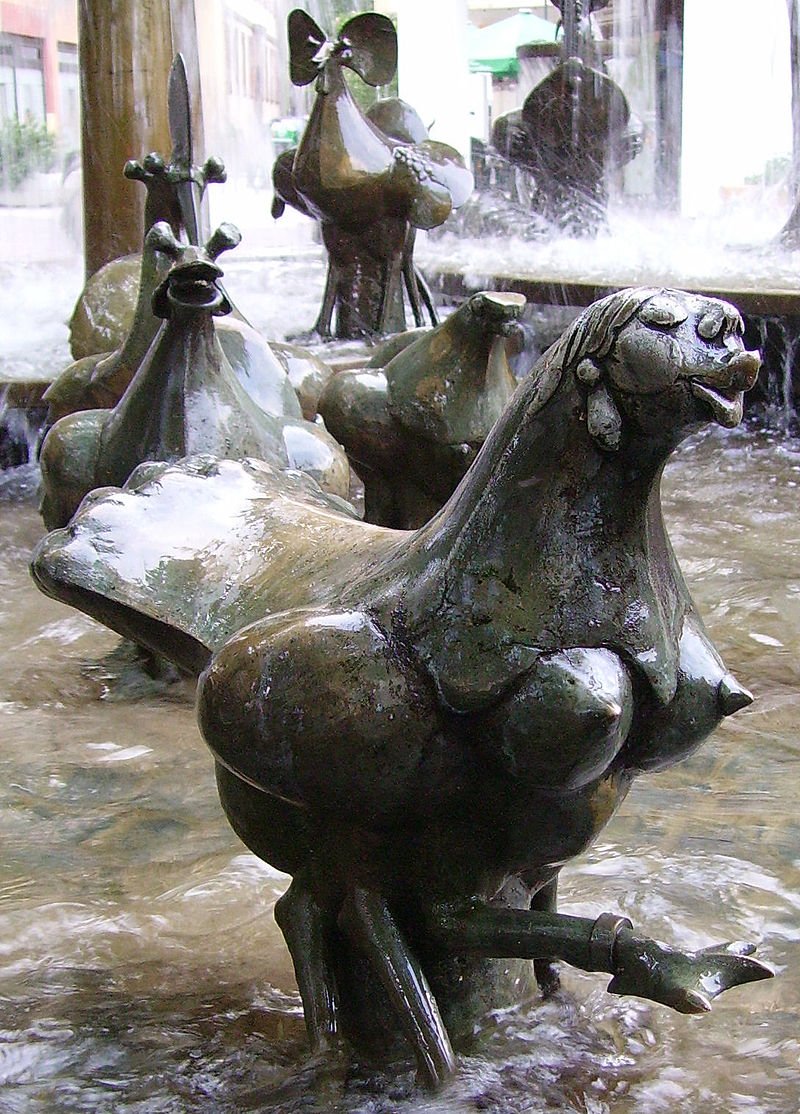 The Elwedritsch is a fictional creature that supposedly inhabits the Palatinate of Germany. It is described as being a chicken-like creature with antlers. It also has scales instead of feathers. However, it is said that their wings are of little use. That is why they live mainly in underbrush and under vines. Sometimes Elwetritschen are depicted with antlers of a stag and their beaks often appear to be very long. In the second half of the 20th century, artists increasingly portrayed Elwetritschen as female by adding breasts. Elwetritschen supposedly originate from crossbreeding chickens, ducks, and geese with mythical wood creatures such as goblins and elves. Being a fowl, they naturally lay eggs, which as a result of descending from forest spirits, grow during breeding season. Eggs in various sizes are artistically depicted at the Elwetritschenbrunnen in Neustadt an der Weinstraße.