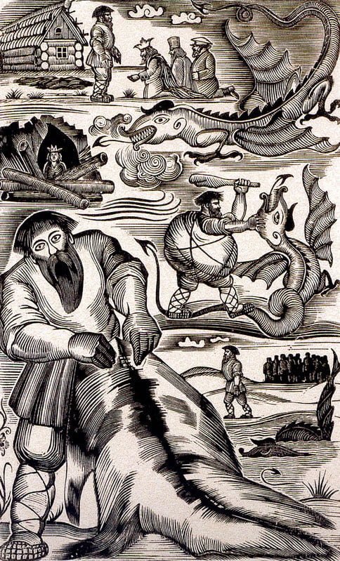 Nikita then went to Gorynych’s lair, and, after a long fight, had the dragon heavily beaten with his heavy wooden club. Frightened, the dragon offered Nikita to become allies and rule the world together. Nikita demanded that they plow the border of their halves of the world, then used the dragon instead of a plowing horse. After they plowed the furrow across the whole world, Nikita demanded that they plow further to divide the sea as well. The foolish Gorynych obeyed and drowned in the ocean.