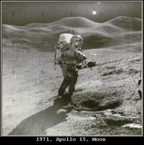 1971 – Apollo 15, Mission Dates: July 26-August 7, CDR: David Scott, CMP: Alfred Worden, LMP: James Irwin Importance: First use of the Lunar Rover, extended Lunar exploration time, focus on field geology. NASA archives (photo No AS15-85-11514)