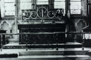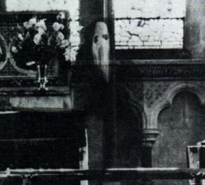 The Spectre of Newby Church (or the “Newby Monk”) is the name given to an artifact found on a photograph taken in the Church of Christ the Consoler, on the grounds of Newby Hall in North Yorkshire, United Kingdom. The image was taken in 1963 by the Reverend K. F. Lord. As the artifact appears to resemble a human, much speculation has been had regarding what type of person might be in the image. Most speculation by believers has concluded that it resembles a 16th-century monk, with a white shroud over his face, possibly to mask leprosy or another disfigurement. Others contend that it is an accomplice in a costume.